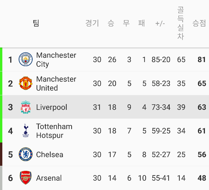 맨시티 선두 재탈환…리버풀 승점 97점으로 준우승? 리버풀 맨시티. 일반 맨시티 리버풀 각팀 최근 전적.